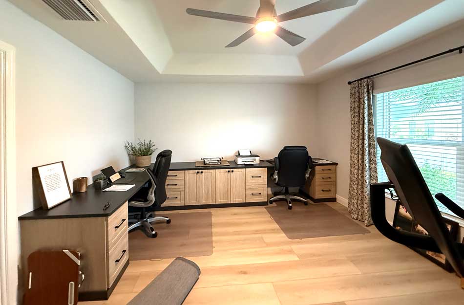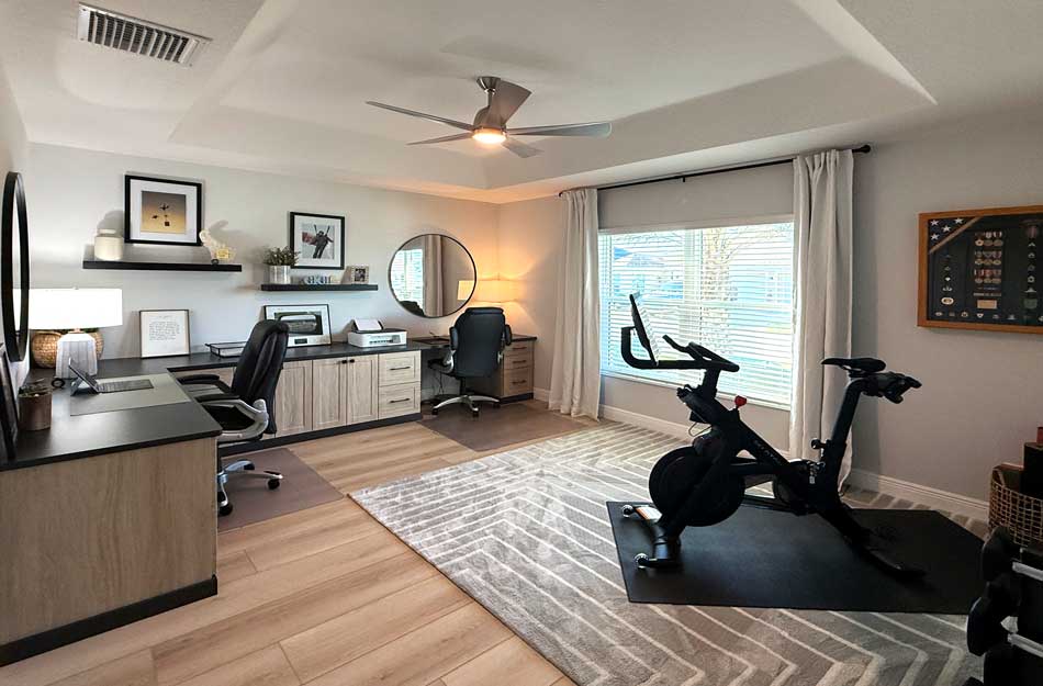 Webster’s dictionary defines harmony as a pleasing arrangement of parts, and I think that is what we seek in every room, yet in the world of design harmony reaches far beyond the aesthetic. Harmony is not only about how things look but also about how a space supports the way we live. Some rooms invite stillness and reflection while others encourage movement and energy. When those two needs share the same four walls, the challenge becomes finding a rhythm that allows both to thrive. Can an office space devoted to sitting and thinking live in harmony with an exercise space that invites strength and motion. Let’s take a peek into the dual-purpose room of a Zinnia model to see how these two activities come together in perfect harmony somewhere in the heart of The Villages.