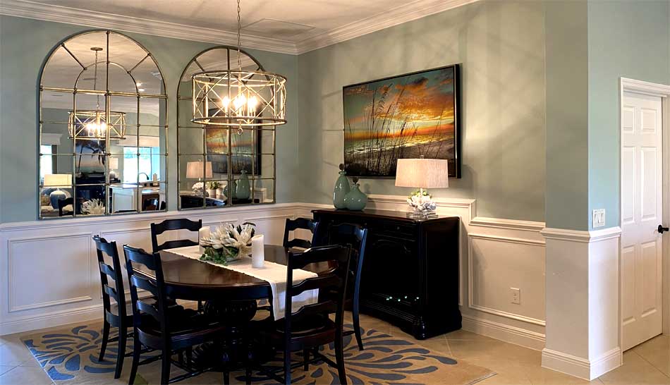 This dining room features a large wall directly opposite the expansive sliders, which offer stunning views of the golf course and unforgettable sunsets. To bring that light and scenery deeper into the space, we installed two Palladian mirrors, each measuring 72 inches high by 48 inches wide. The effect is stunning! The mirrors reflect so much of the view that it feels as though two additional windows have been added. They fit seamlessly between the crown molding and the wainscoting, enhancing the architecture and making the room feel brighter, more open, and beautifully finished.