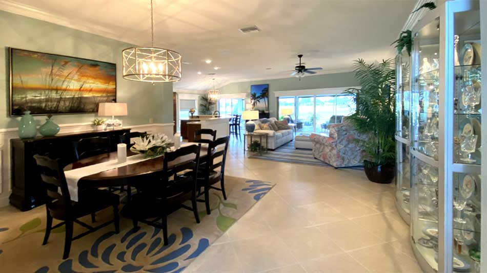 For the past twenty years, one request has remained constant: “I want light, bright, and airy.” Clients crave comfort. They want ease of use. And most of all, they want their home to feel finished. When people move to Florida from northern climates or out west, something begins to shift. It’s not because we use different furniture or follow a particular design trend. It’s because the homeowners themselves begin to change. They begin to crave lighter colors. They notice how sunlight travels through a room. They’re drawn to natural textures, coastal imagery, and pieces that evoke life near the water, even if they’re miles from the shore. I’ve watched this evolution unfold again and again. Clients want rooms that feel like a breath of fresh air. If they have a beautiful view, they want to showcase it. They want spaces that reflect light, welcome guests, and invite them to linger. Let’s take a peek into the dining room of an Ivy model to see how light and bright come together to create a welcoming Southern Home somewhere in the heart of The Villages.