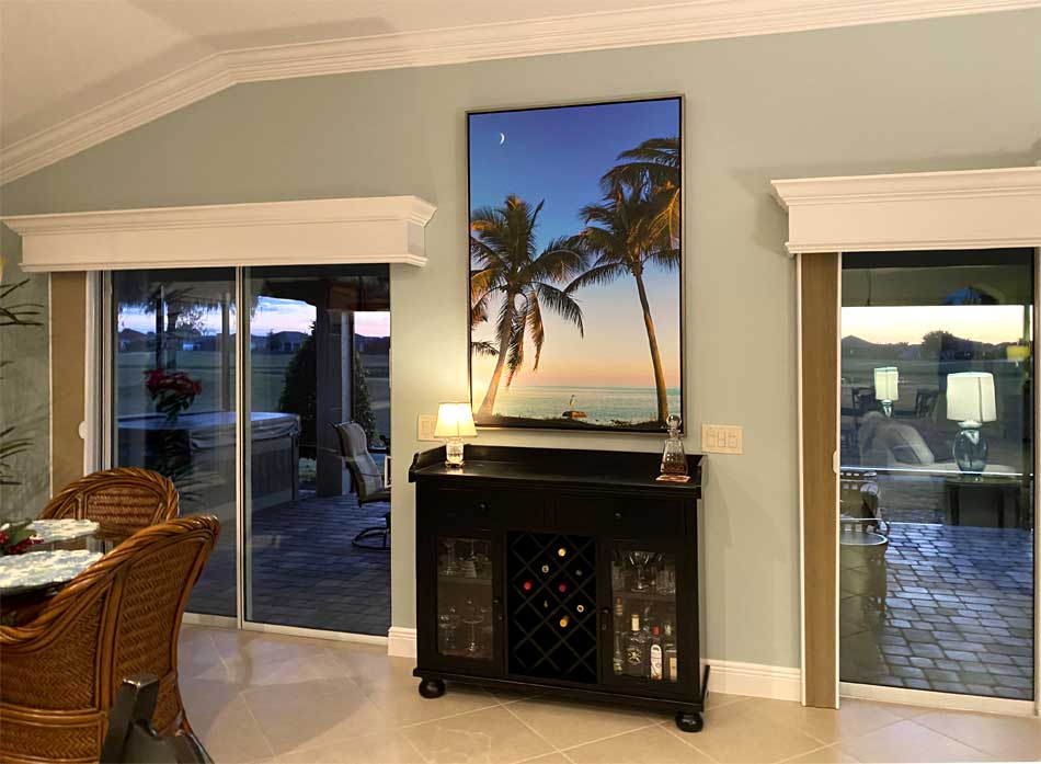 Few things rival the beauty of a Florida sunset. This particular image is a stunning representation of a winter evening in Florida, with colors that echo the sky just beyond the homeowner’s backyard. Each night, the golf course is bathed in those same soft hues of corals, golds, and smoky blues, that stretch across the horizon and settle gently into the landscape. It’s a view that feels both expansive and personal, and the photograph brings that moment indoors forever captured in time.