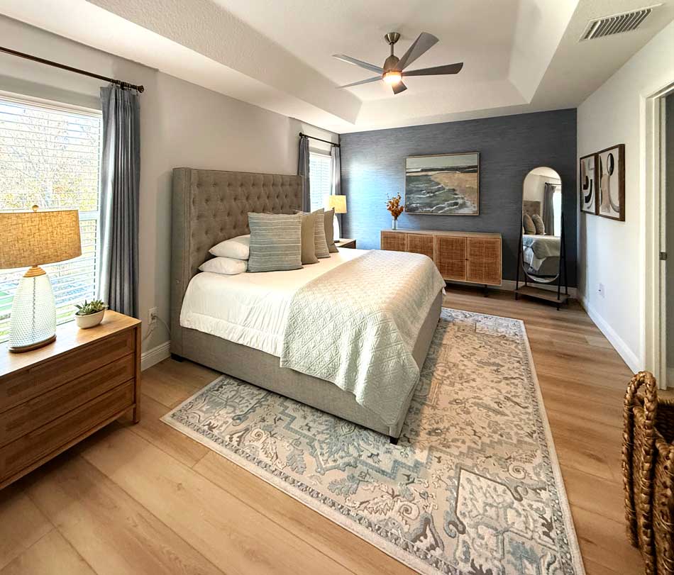 Do you remember when you bought your first house and everything felt wonderful simply because it was your first house. The floor could have been slanted, and you would not have cared because that home represented forward movement in your grown-up life. It was a beginning and beginnings have a way of softening every flaw. Fast forward to your second home and you are a little older. You have had time to think about what you do not want, and when you buy that next house there are things you inherit that you assume you will change right away. This cycle of buying and changing continues for anyone who is not purchasing a brand-new home. Yet there are often good things in those inheritances if the new homeowner pauses long enough to see them before replacing everything. Inheriting pieces from a previous owner is common and can lighten your financial load if you build on what is already there rather than wiping it out. Warm minimalism fits beautifully into this idea. It does not demand a blank slate. It simply requires that you notice what has potential and let the room evolve from there. Sometimes a single inherited element becomes the anchor for the entire space. Let’s peek into the Master bedroom of a Zinnia model to see how the new homeowners used their inheritance to create a warm minimalist space that invites relaxation and soothing vibes somewhere in the heart of The Villages.
