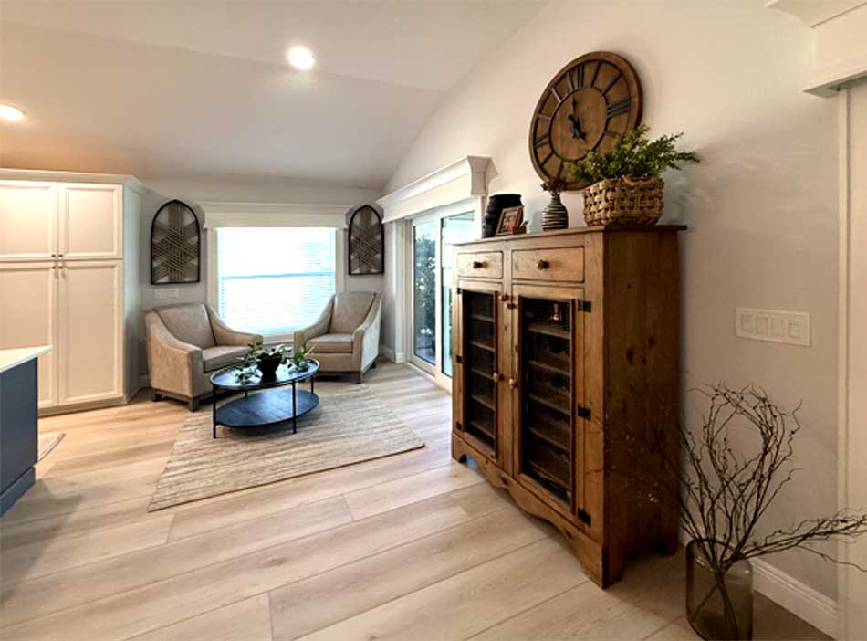 This nook is typically used as an eat-in kitchen, but it’s a space that can feel tight if the table is too large. In this home, the owners already enjoy meals at a spacious dining room table, a generous island, and a large lanai table, so they were understandably puzzled about how to use this area. Creating a cozy nook here was a natural choice. Tucked back into the home, it feels wonderfully private and inviting. It’s the perfect spot to read the paper, sip coffee, or enjoy a quiet moment and the TV is in the direct line of sight, for added comfort. We anchored the space with two Mariko chairs from Best Furniture Company, hands down the most comfortable chairs I’ve ever recommended. Instead of a traditional dining table, we opted for a small coffee table to provide a grounding effect. If needed, a petite side table could easily be placed between the chairs for added function. To define the area, we added a 5×7 rug and hung several decorative panels above the chairs to create a finished look. The windows are trimmed with crisp casement molding and topped with white wood cornices, which lend a cohesive, tailored feel. Hidden behind the cornices is a drop-down privacy blind that activates with the touch of a button. The look is practical and polished. The homeowners had just enough wall space between the sliders to add a hutch that doubles as a wine rack. To complete the transformation, we removed the chandelier and replaced it with an integrated recessed light. This new fixture offers dimmable lighting and remarkable longevity. You won’t need to change the bulb for 25 years. It’s a sleek, low-maintenance solution that keeps the space feeling open and modern.